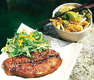 Yakiniku på svamp med ris och sesamstekt broccoli