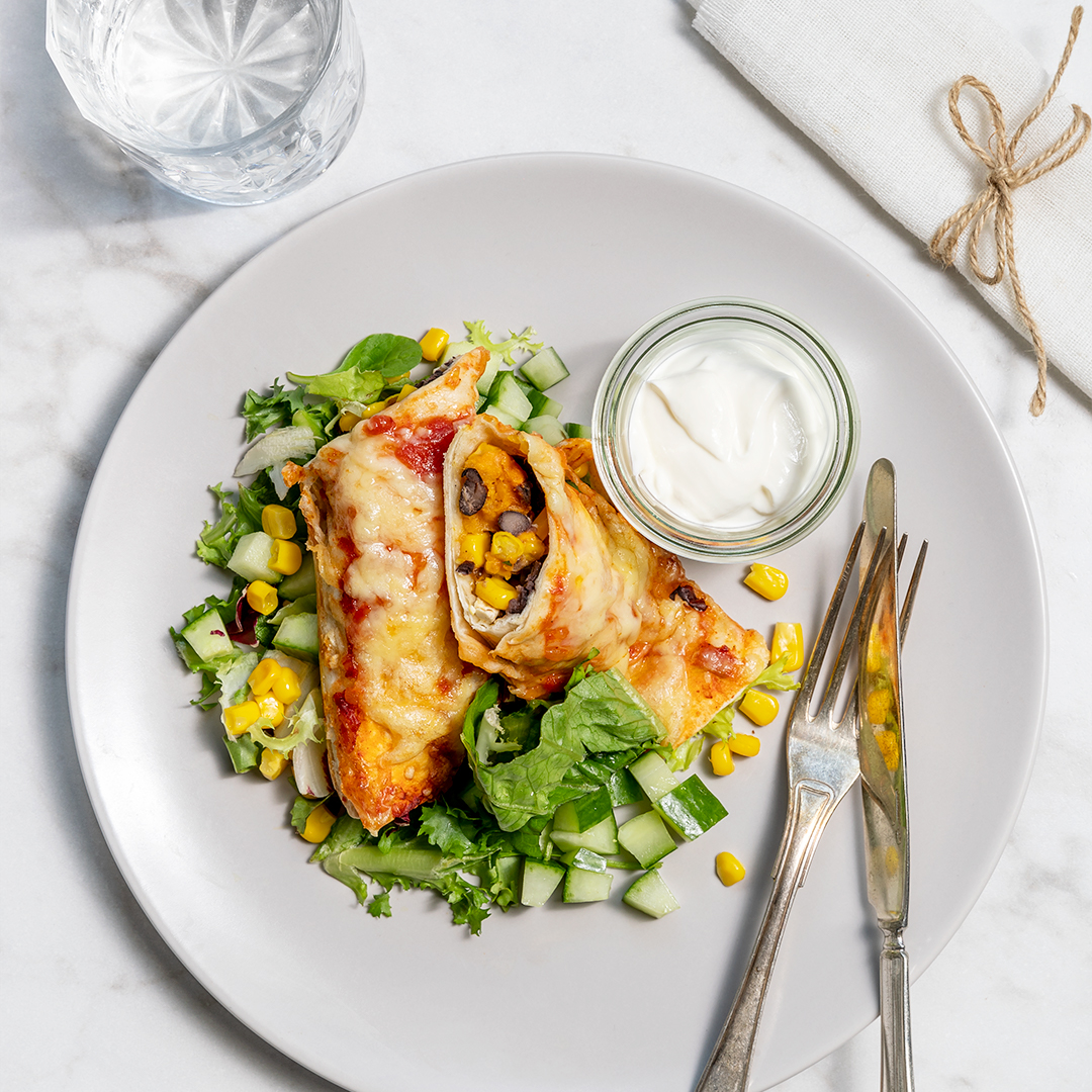Sötpotatiswraps med fetaost och kryddiga bönor