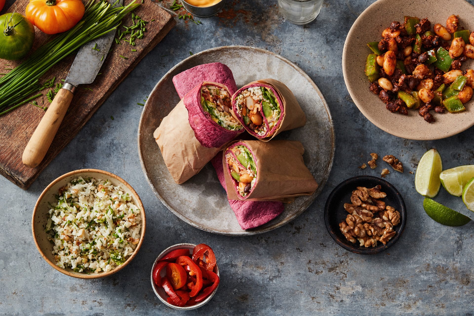 Bönfylld burritowrap med örtigt blomkålsris i rödbetstorilla