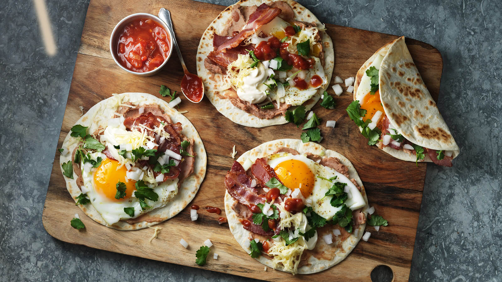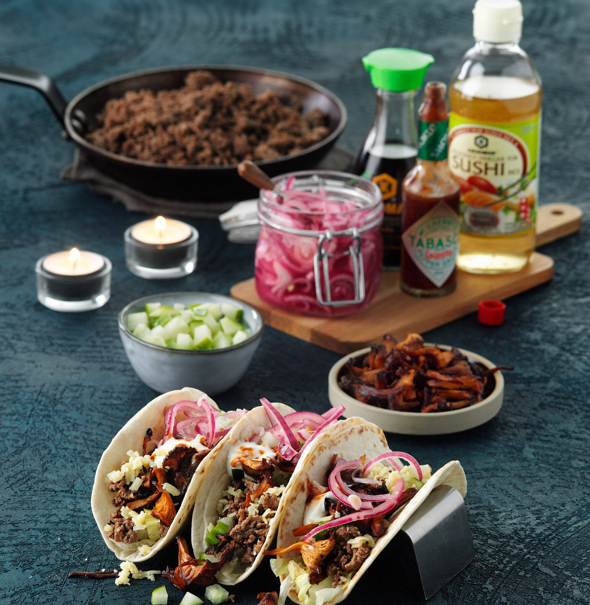 Vegetariska texmexjärpar i wrap med picklad rödlök och chilidressing