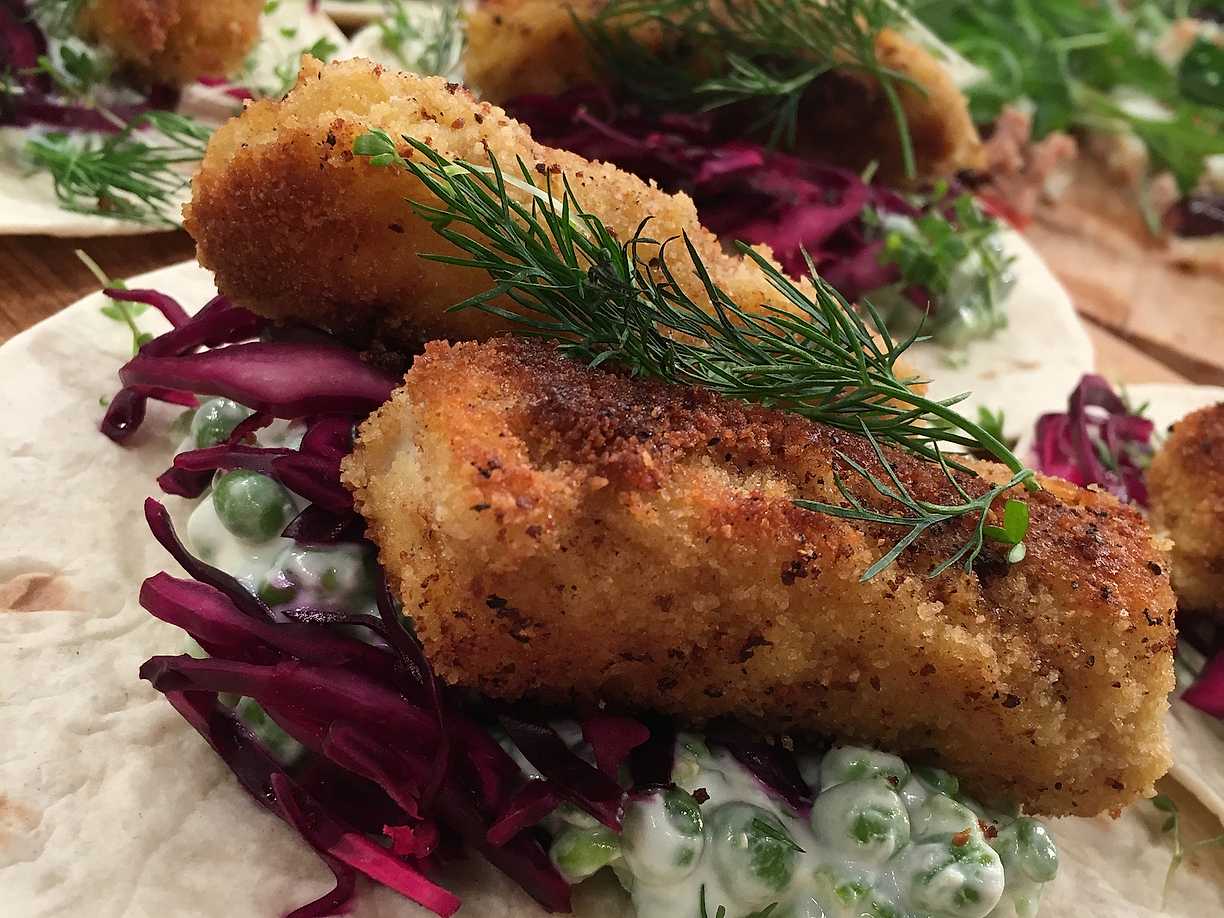 Fishtaco med syrlig rödkålsallad och ärttzatziki