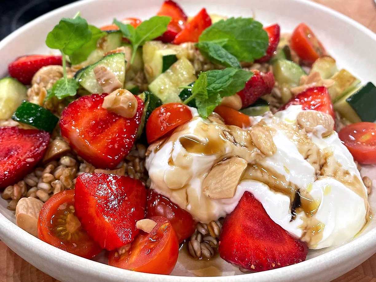 Stekt lax med het majs och zucchinisallad toppad med fetaost